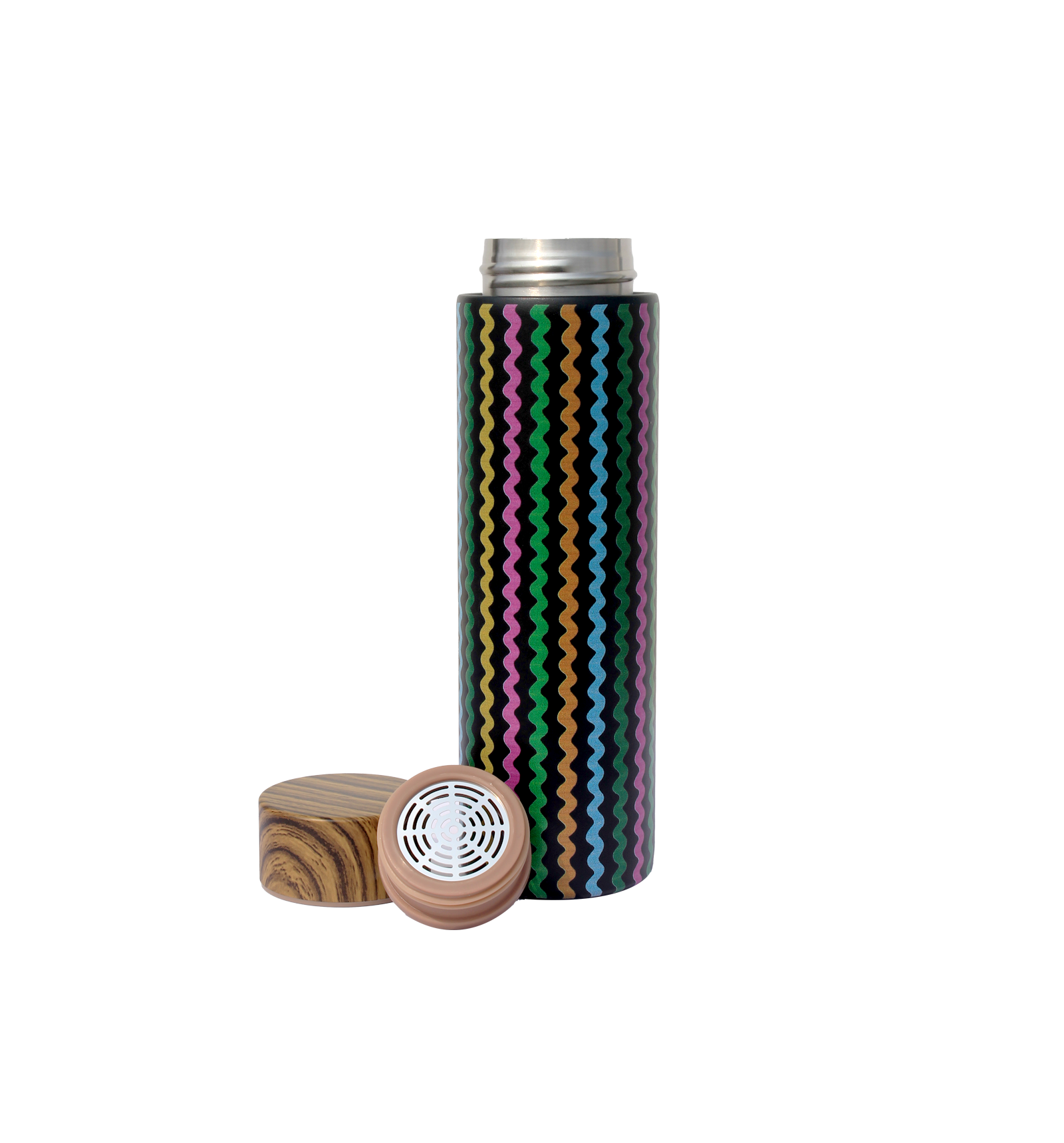 Wooden cap with removable tea infuser for loose leaf brewing.