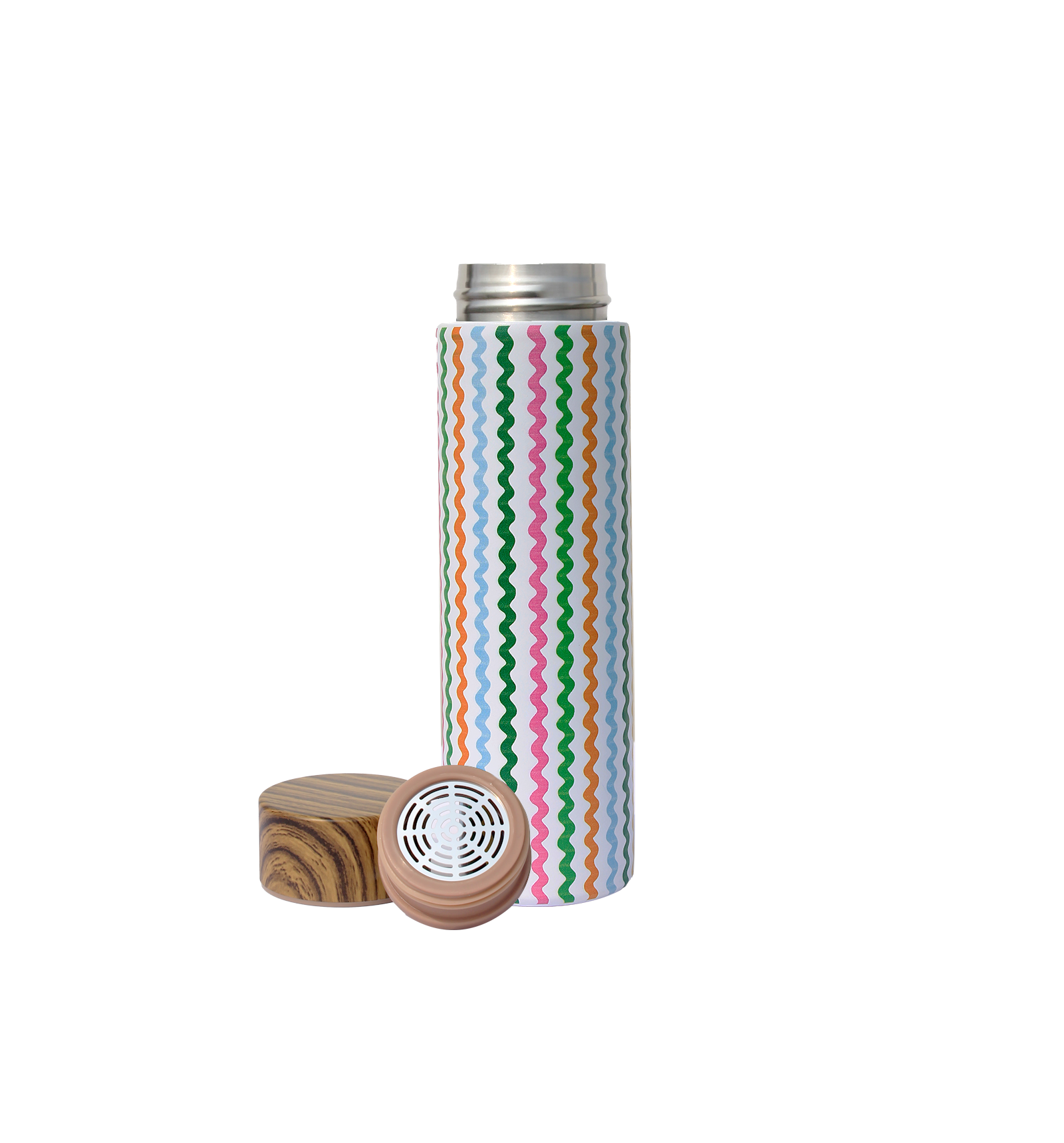Wooden cap with removable tea infuser for loose leaf brewing.